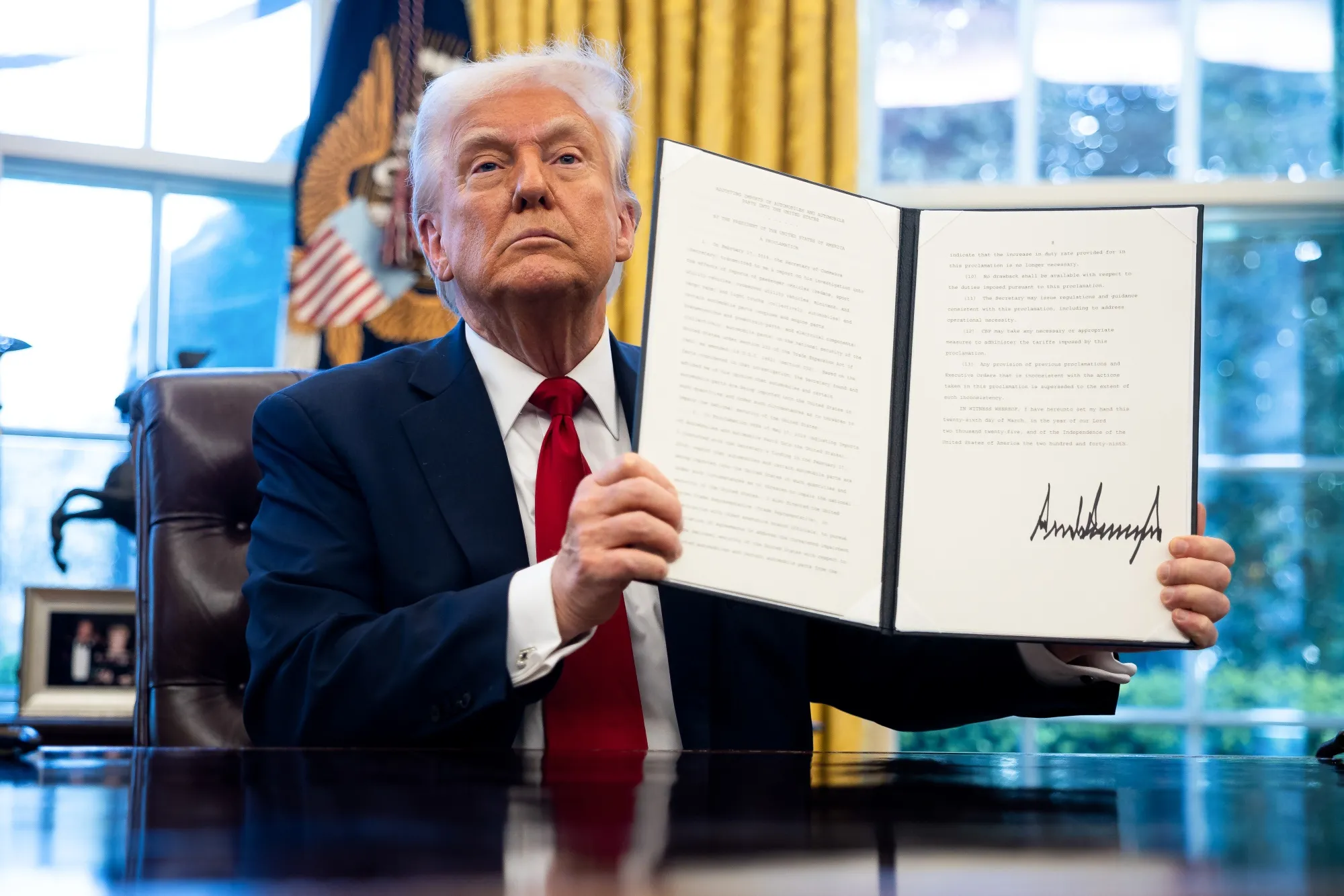 3月26日,唐纳德·特朗普在椭圆形办公室手持一份已签署的行政命令。照片:弗朗西斯·钟/Politico/彭博社文章原标题:特朗普下周起对汽车进口征收25%关税(3)
