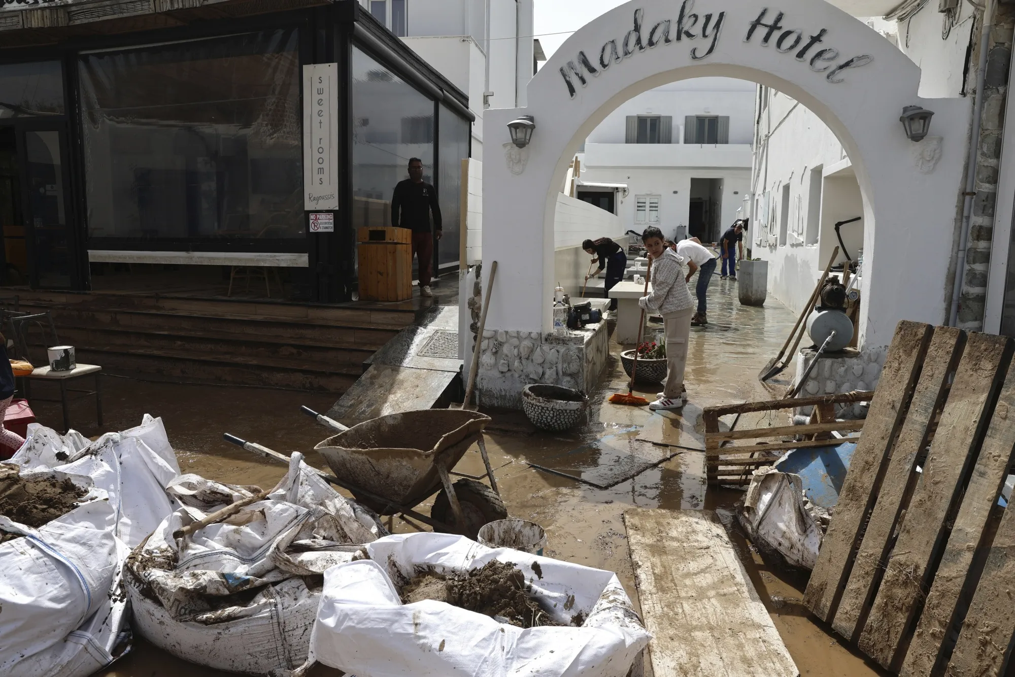 4月1日,帕罗斯岛上,人们正在清理被洪水淹没的酒店淤泥。摄影师:约翰·利亚科斯/InTime新闻社/美联社周一深夜至周二凌晨,强降雨和雷暴严重袭击了热门度假基克拉泽斯群岛的米克诺斯岛和帕罗斯岛,引发洪水、山体滑坡并破坏当地道路网络。