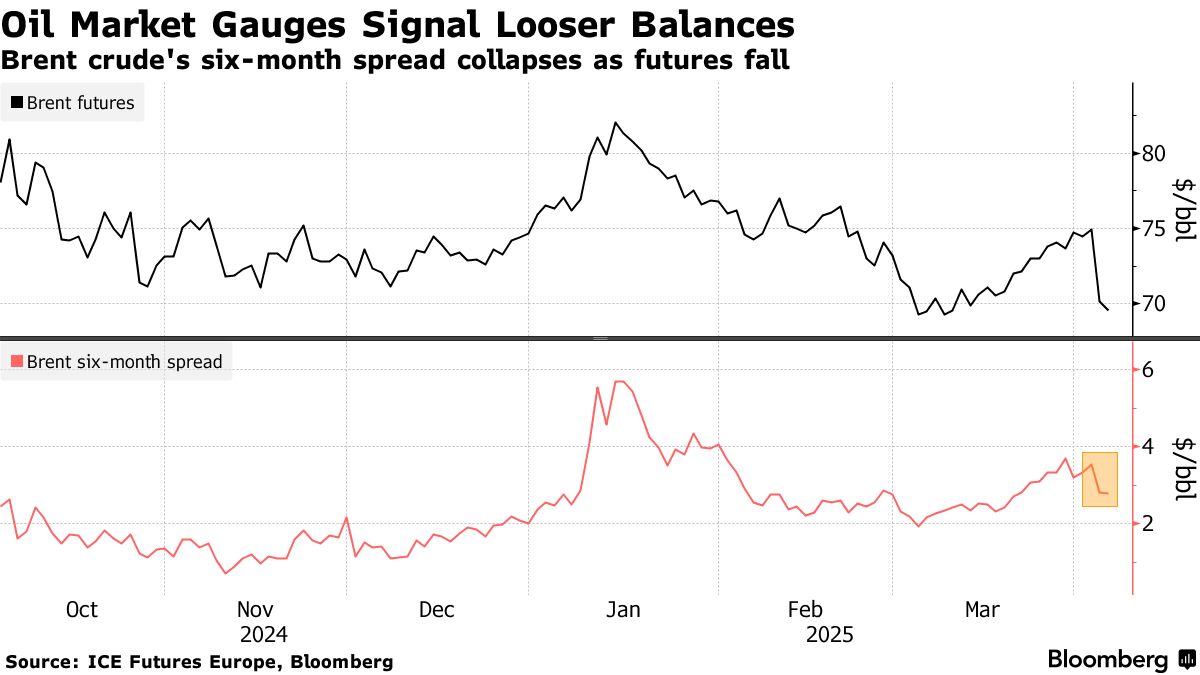 跨月价差大幅收窄之际,主力期货价格也在下跌。周四油价创下2022年以来最大跌幅,在特朗普总统宣布一系列关税措施后暴跌逾6%,随后欧佩克立即采取了行动。