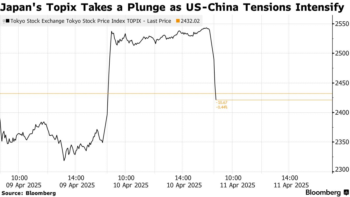 周五的抛售可能使东证指数和日经指数本周收跌,此前美中贸易争端恶化导致美国股市大跌。美国总统唐纳德·特朗普表示,他的关税政策可能会造成“过渡性问题”,但在白宫澄清美国对华关税已提高至145%后,他对自己的计划表示有信心。