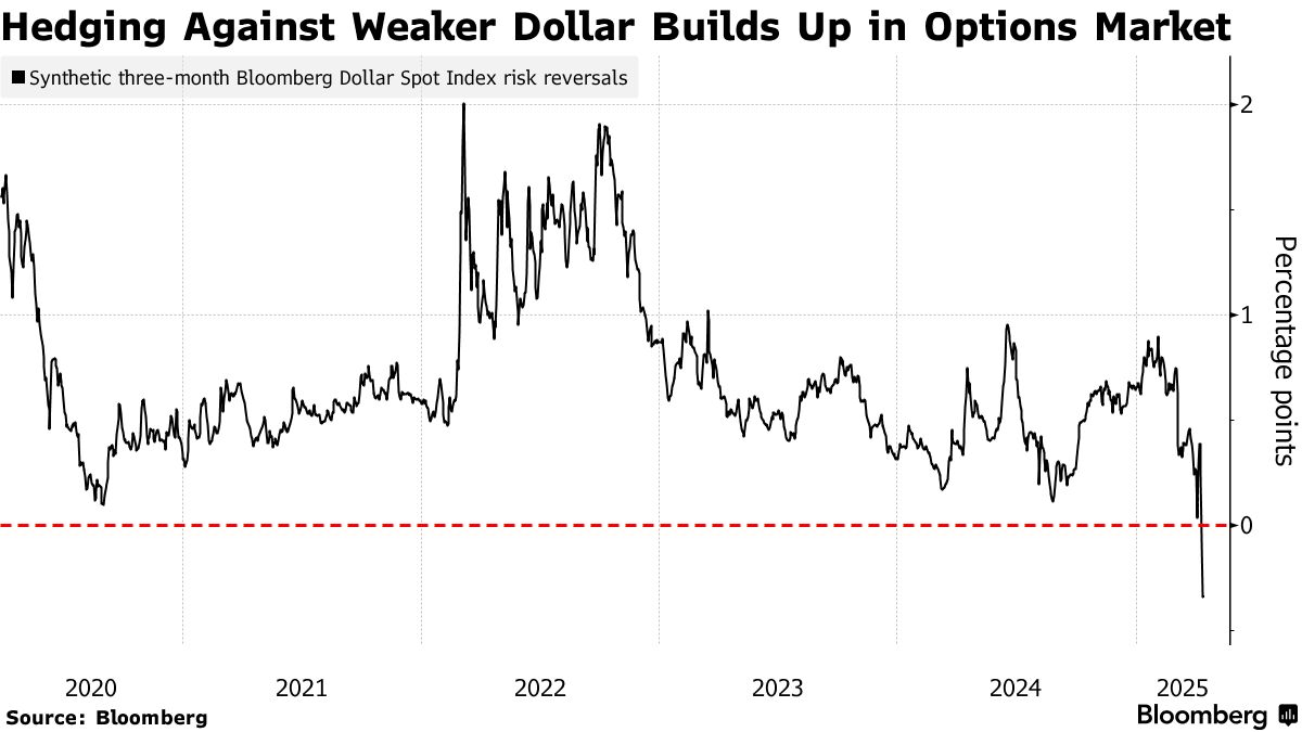 由于特朗普政府的关税政策可能削弱美国经济优势并损害美元地位,对冲潜在美元下跌的需求已跃升至五年高位。