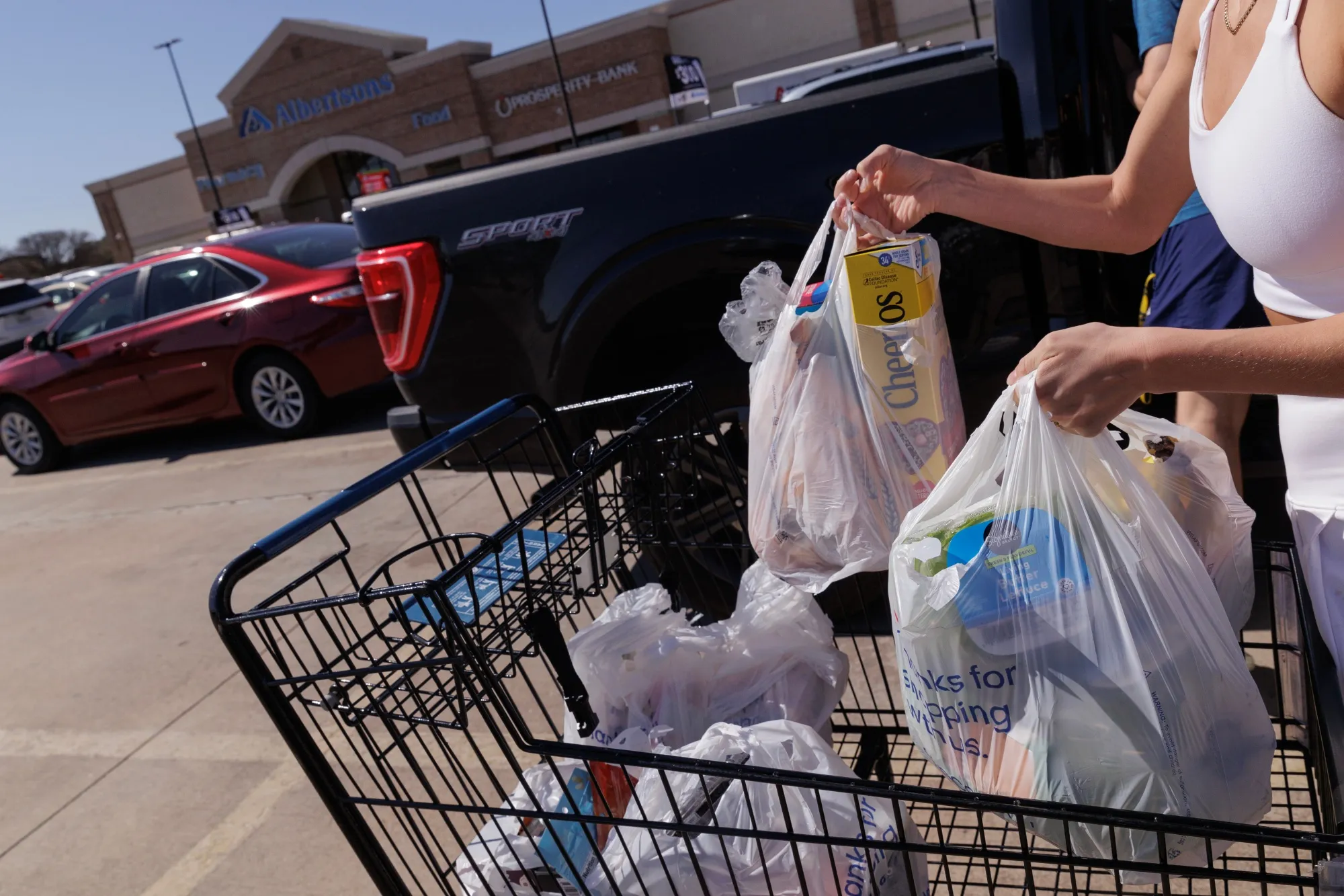 德克萨斯州大草原城一家Albertsons超市外的购物者。摄影师:Shelby Tauber/BloombergAlbertsons公司预测今年收益将低于预期,酝酿中的贸易战可能导致物价上涨并抑制消费需求。