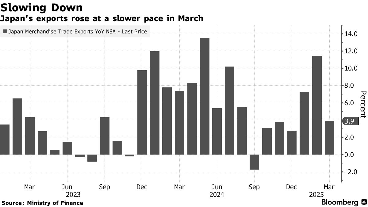 特朗普的关税战正在打击华盛顿的盟友和对手,并可能严重扰乱全球商品流动。3月份日本对美出口额增长3.1%。对已采取反制措施的中国出口下降4.8%,对同样回击美国的欧洲出口下降1.1%。日本表示不会采取报复性措施。