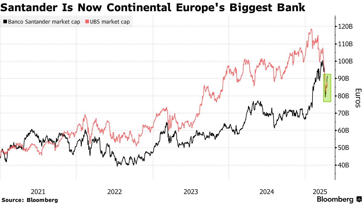 桑坦德银行现已超越瑞银集团,成为欧洲大陆市值最高的银行。