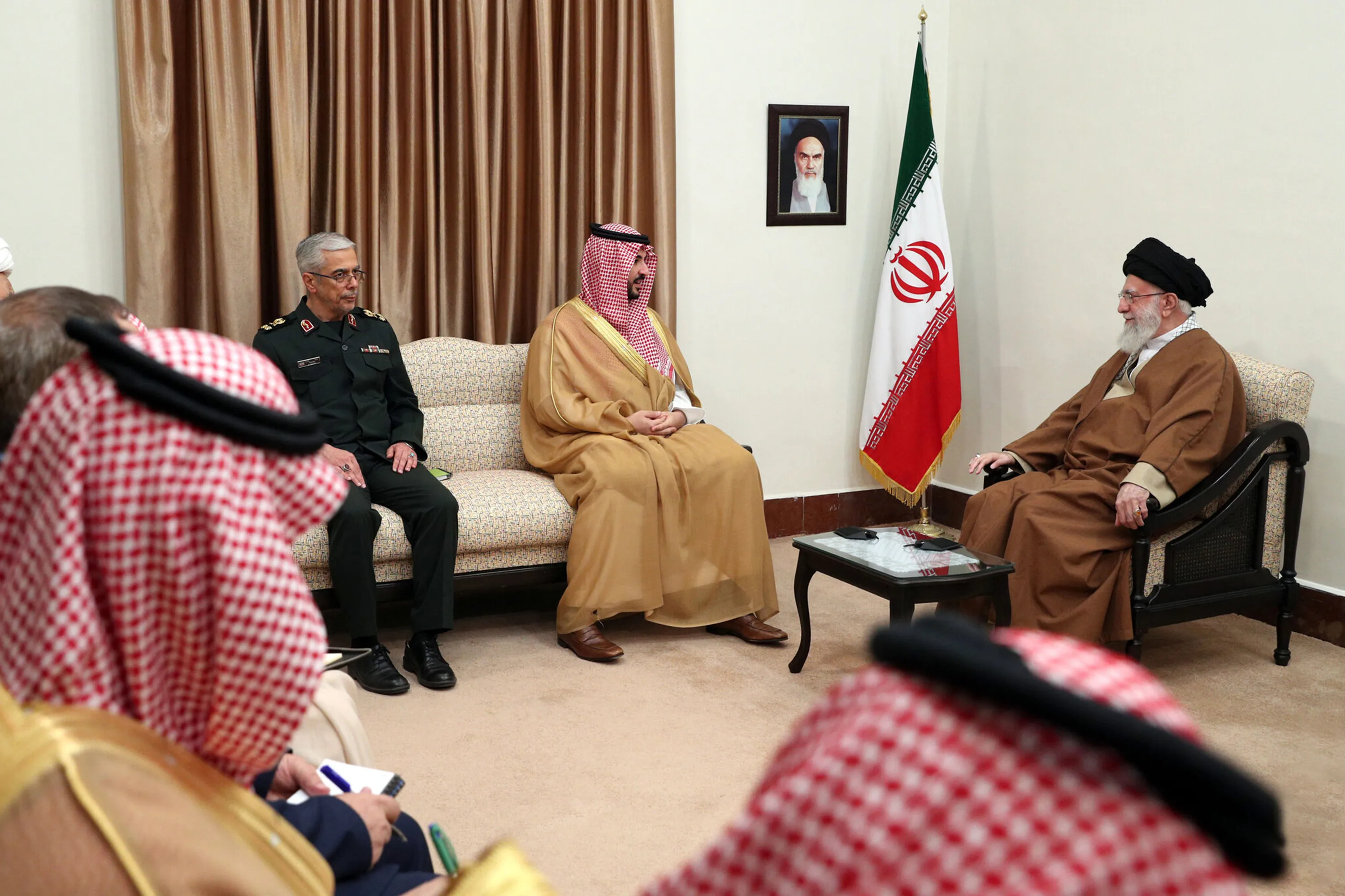 4月17日,伊朗领导人新闻办公室提供的照片显示,哈立德·本·萨勒曼在伊朗德黑兰会见阿亚图拉阿里·哈梅内伊。
