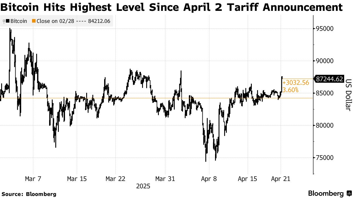 根据彭博汇编数据,这个市值最大的加密货币周一新加坡早盘跳涨约3%,突破87,600美元,几乎收复了自特朗普4月2日宣布对等关税措施以来的全部跌幅——该政策曾导致全球市场陷入动荡。