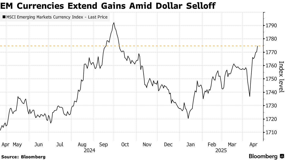 美元疲软获得新的动力,此前美国总统特朗普考虑解雇美联储主席杰罗姆·鲍威尔,引发对央行独立性的担忧。这导致彭博美元即期指数暴跌至2024年1月以来的最低水平,此前该指数已连续三周走弱。