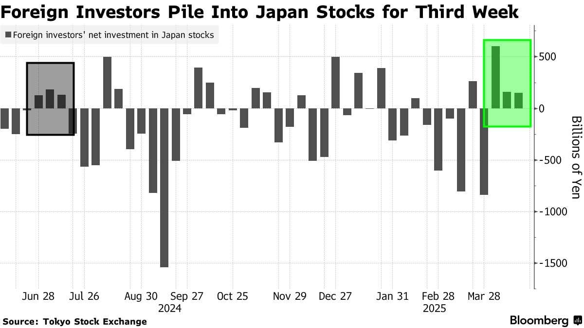 摄影师:高安翔子/彭博社受美日贸易谈判乐观情绪推动,加之市场猜测投资者正从美股转向多元化配置,外资已连续第三周净买入日股。