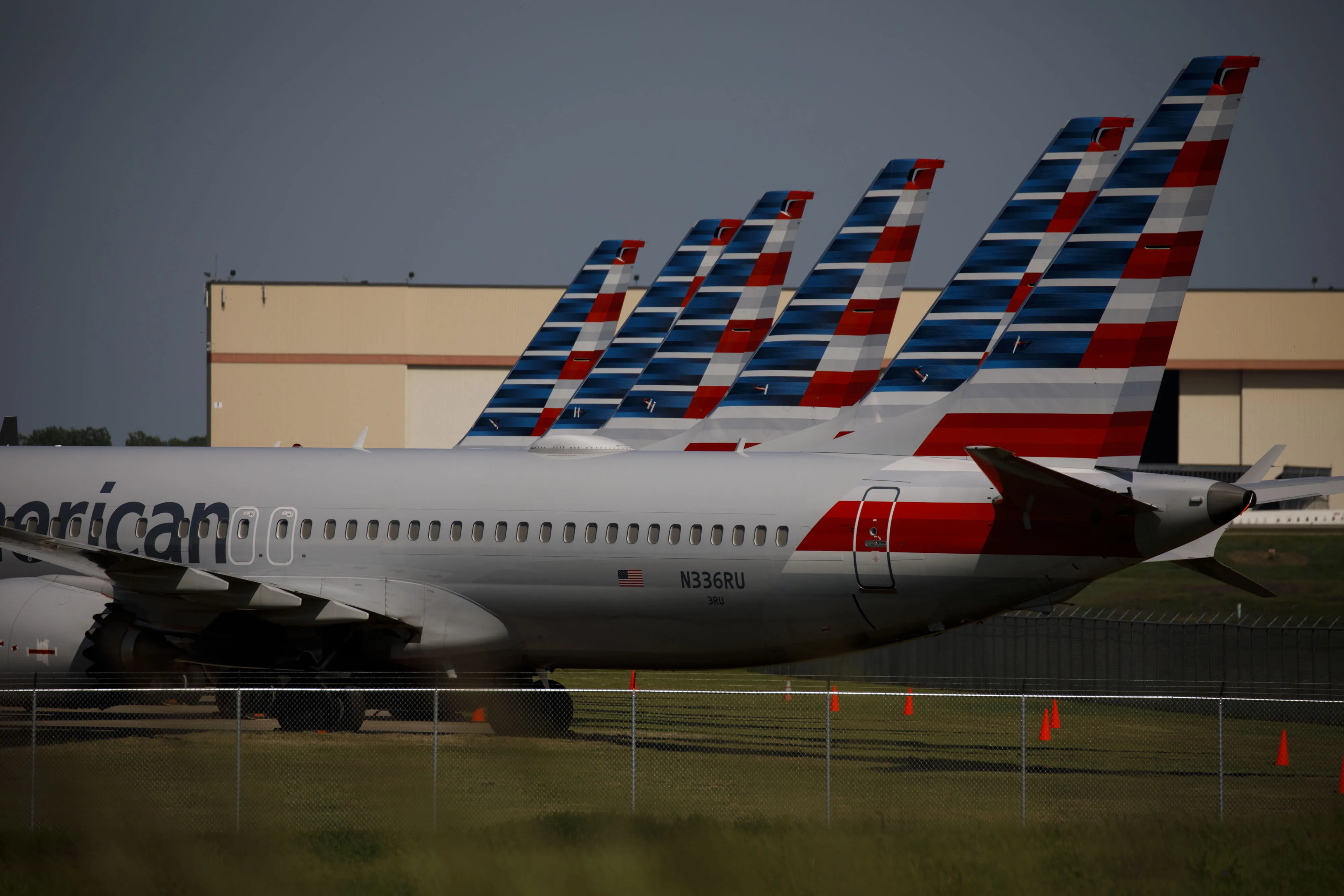 美国航空集团的飞机停放在俄克拉荷马州塔尔萨国际机场的维修机库外。