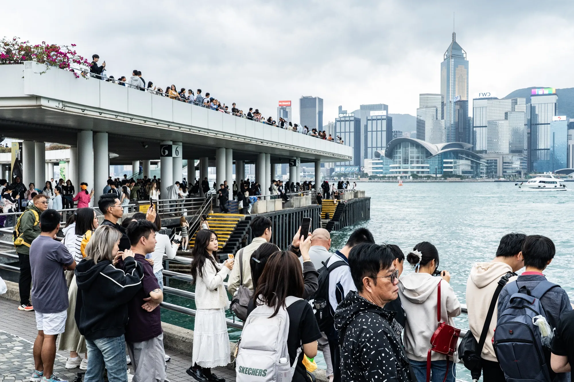 游客参观香港尖沙咀海滨长廊。摄影师:中国新闻社/中国新闻社据《大公报》报道,香港酒店在中国即将到来的“黄金周”期间需求旺盛,许多酒店几乎已被预订一空。
