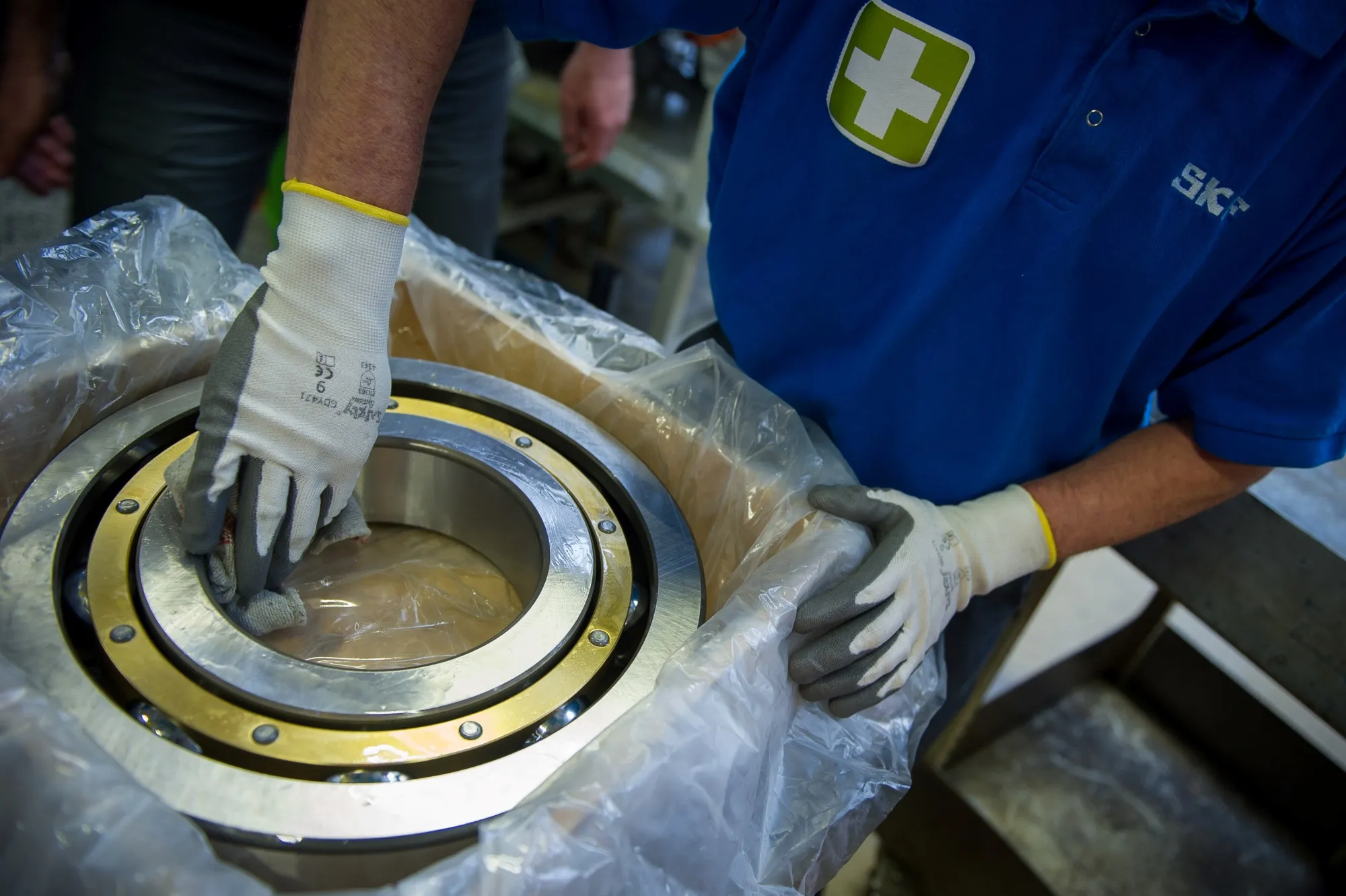 一名员工在SKF工厂内为风力涡轮发电机加工球轴承。