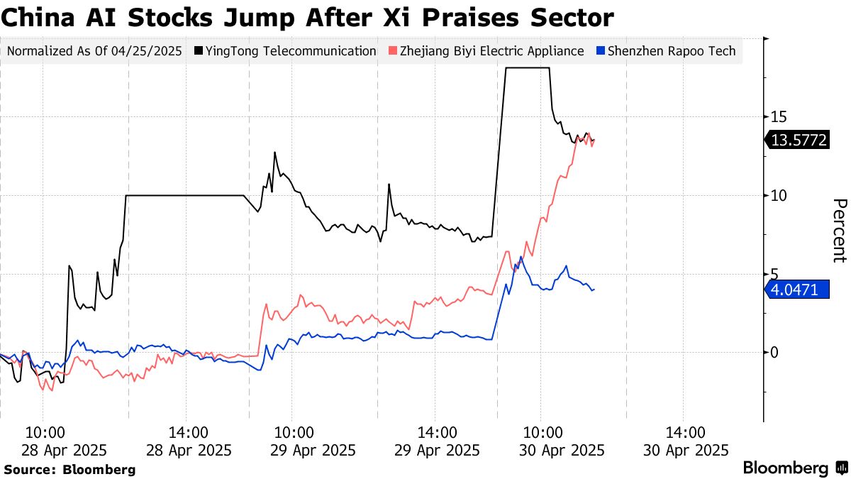 中国智能设备制造商的股价在习近平主席考察上海人工智能创新中心后上涨。