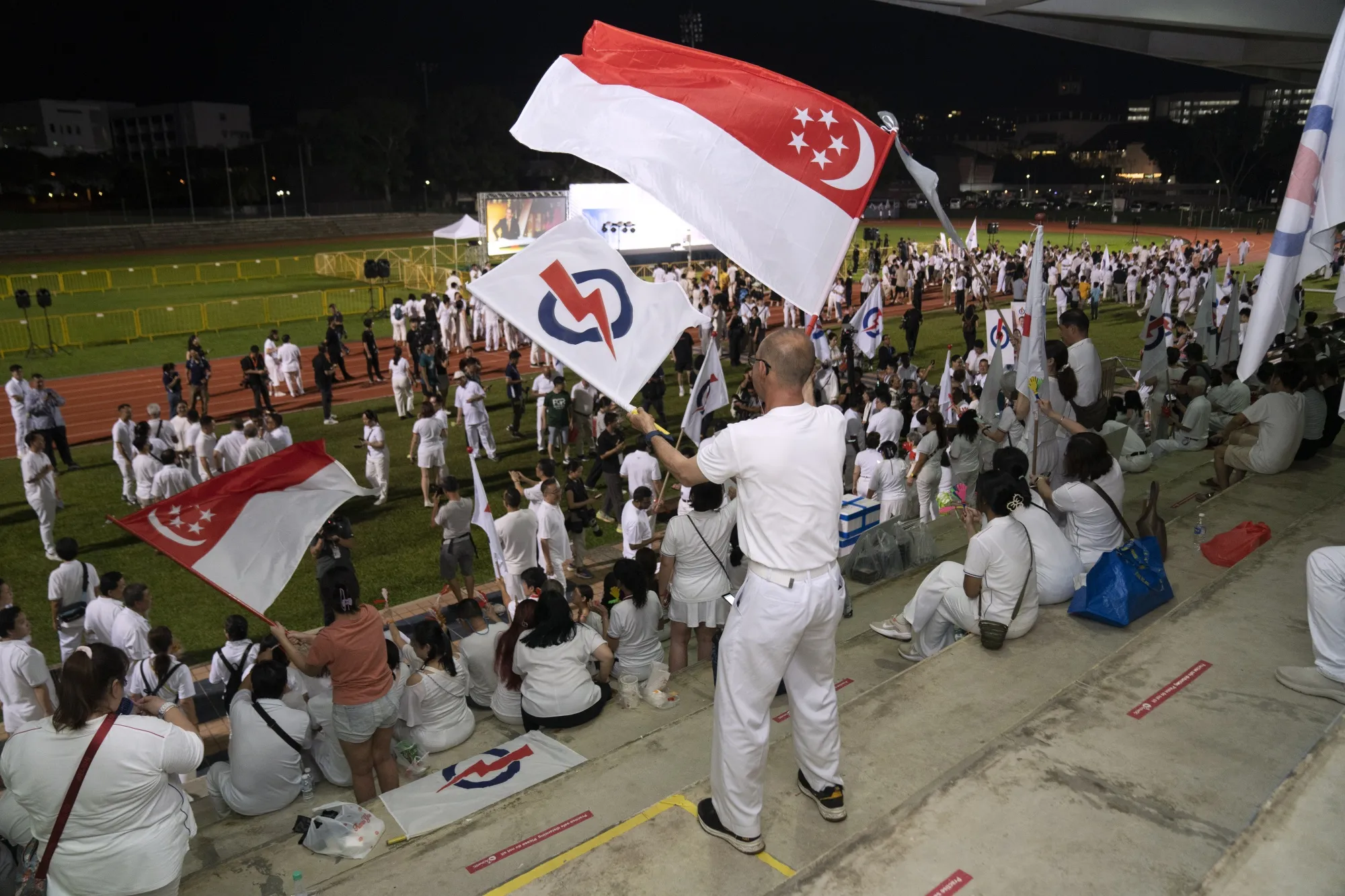 5月3日新加坡大选之夜,支持者挥舞人民行动党党旗和新加坡国旗。
