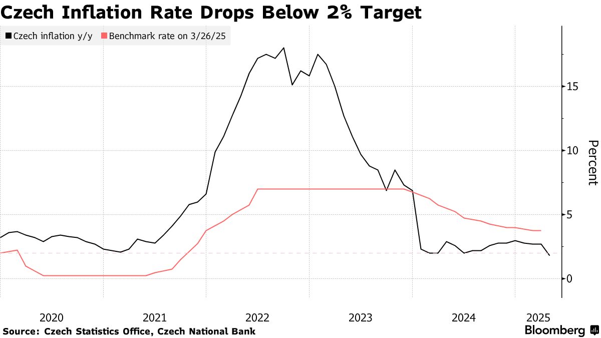 捷克通胀放缓幅度超出预期,创下七年来的最低水平,这几乎确定了市场对央行本周将降息的预期。