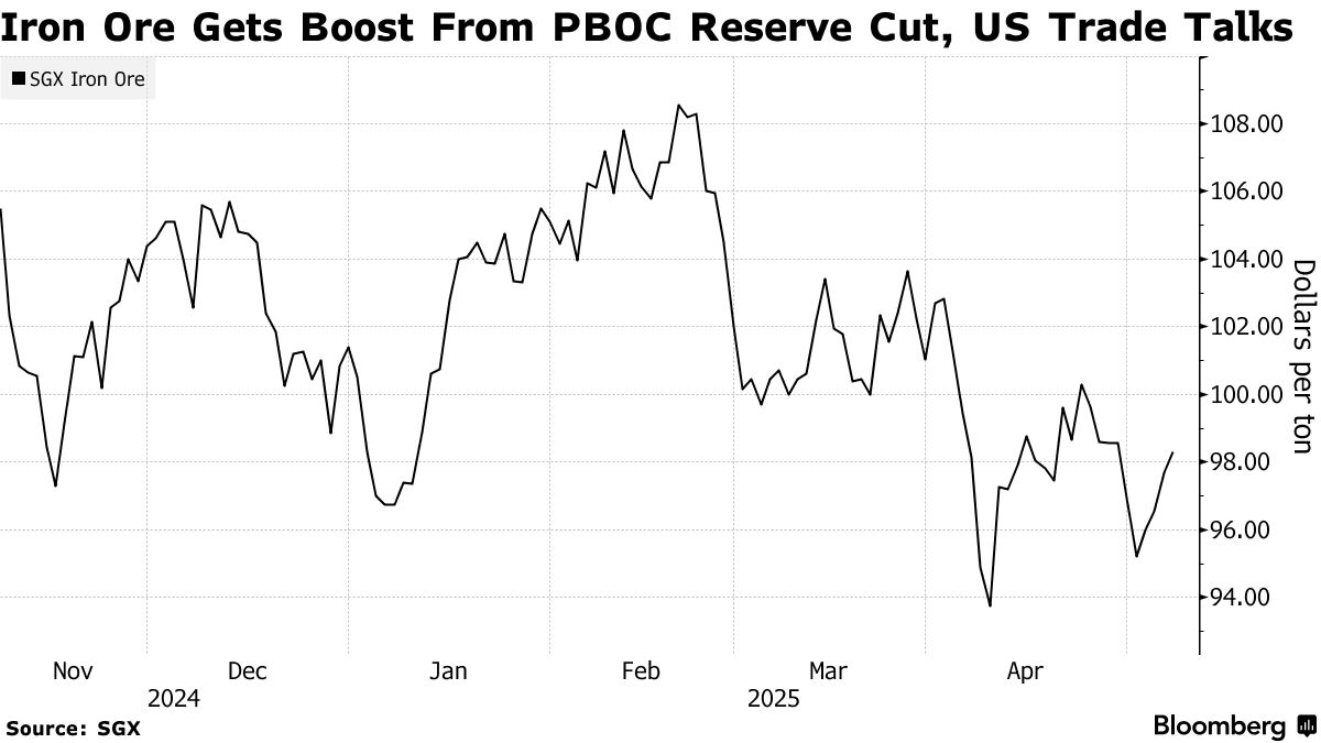 铁矿石价格攀升,因中国下调政策利率并降低金融机构存款准备金率,与此同时美中双方同意开展贸易谈判。