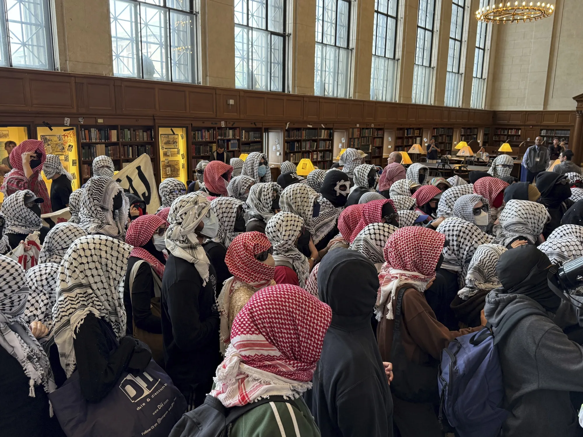 由多个亲巴勒斯坦团体组成的"哥伦比亚大学撤资 apartheid"组织在Substack上发文称,超100人"涌入"巴特勒图书馆,将其更名为"巴塞尔·阿拉吉人民大学"。社交媒体图片显示,数十名戴阿拉伯头巾和面罩的抗议者在馆内高呼口号,墙上悬挂着巴勒斯坦旗帜。