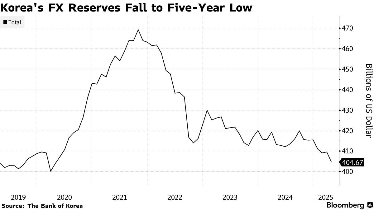 韩国外汇储备在4月底降至4046.7亿美元,创五年新低,部分原因在于国民年金公团与韩国央行扩大了货币互换协议规模。