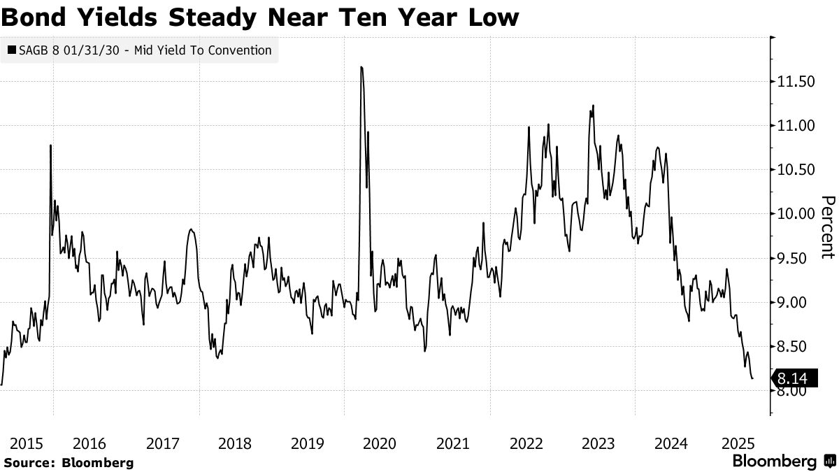周一,南非2030年到期的债券收益率上升了3个基点,达到8.18%,此前在周五跌至2015年以来的最低水平。