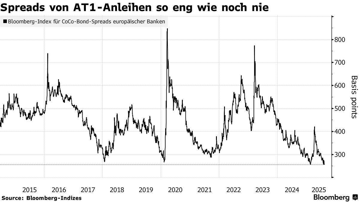 所谓的额外一级资本债券(AT1)的风险溢价已降至历史最低水平。这些具有特殊次级属性的债券是在金融危机后推出的,旨在增强银行的资本基础。但它们风险很高:在危机情况下,这些债券可能变得一文不值。