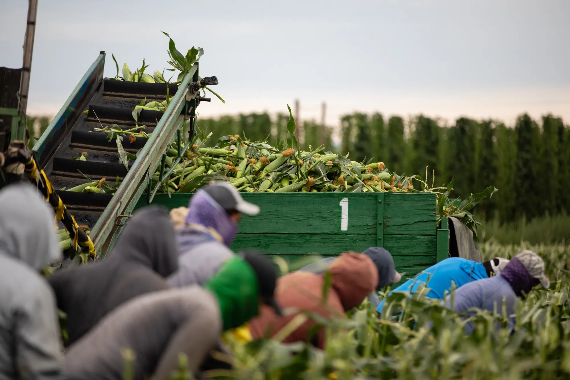 7月31日,华盛顿州瓦帕托农场工人们正在收割玉米。