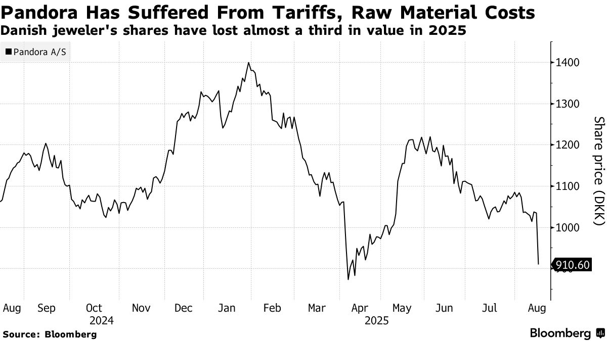 这家串饰制造商正面临经济不确定性导致的消费低迷压力,而美国总统特朗普的贸易政策加剧了担忧。潘多拉近全部珠宝产自泰国,该地区产品面临19%关税。