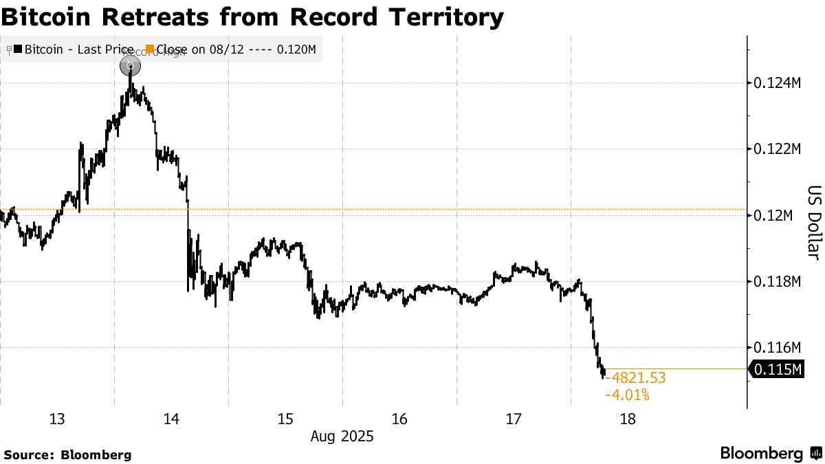 比特币(BTC)、以太坊(ETH)及其他加密货币从历史高位回落——彭博社