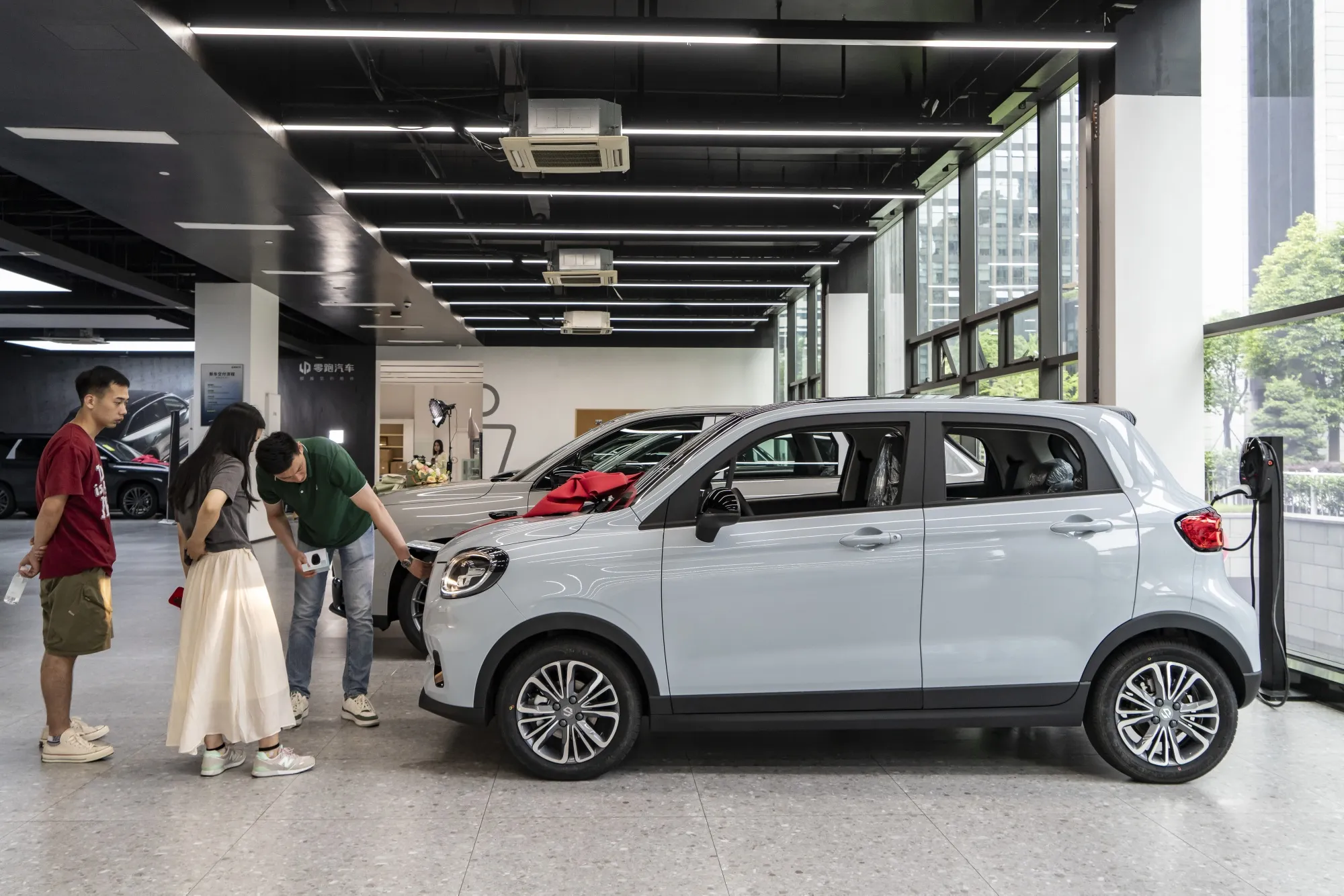 顾客在中国杭州交付中心提走他们的浙江零跑科技T03电动汽车。