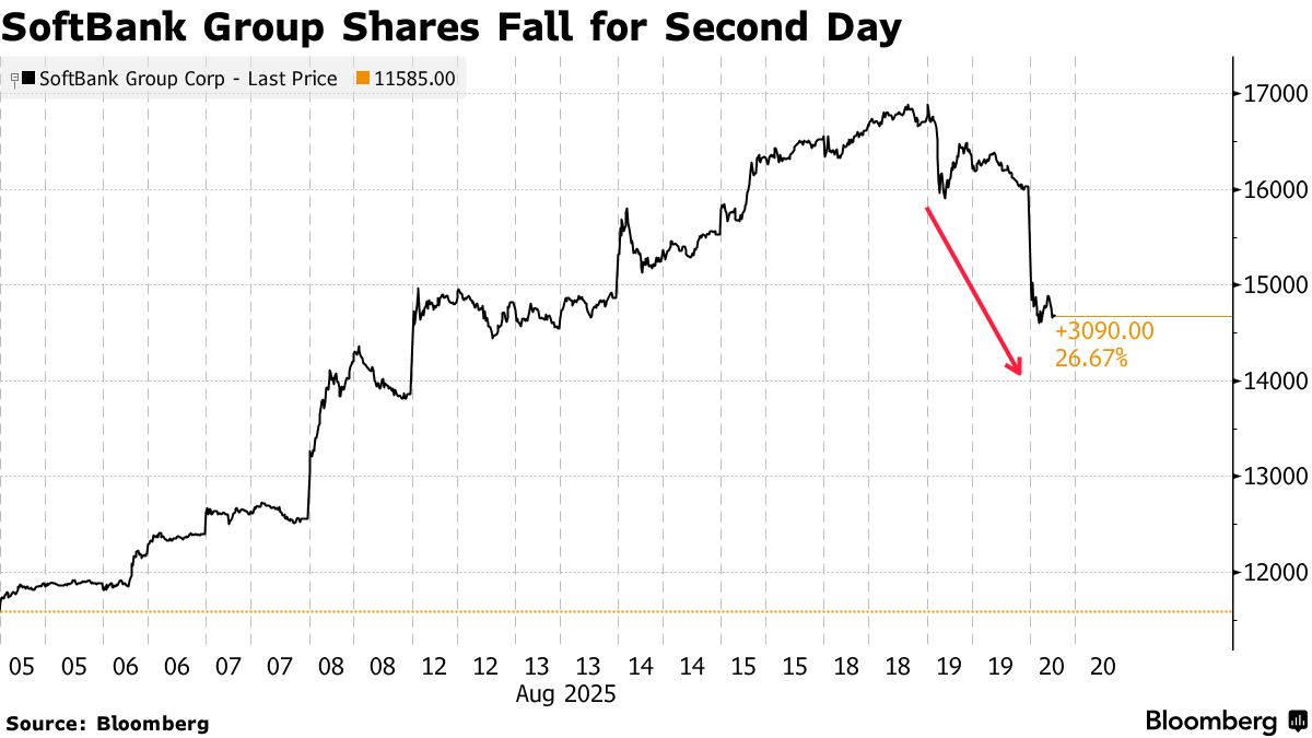 美国科技股整体下跌也拖累了软银股价,该公司因投资人工智能领域近几个月来股价飙升。纳斯达克100指数周二录得自4月关税冲击以来第二大跌幅,市场日益担忧近期涨势过快过猛。软银投资的企业包括Arm控股公司。