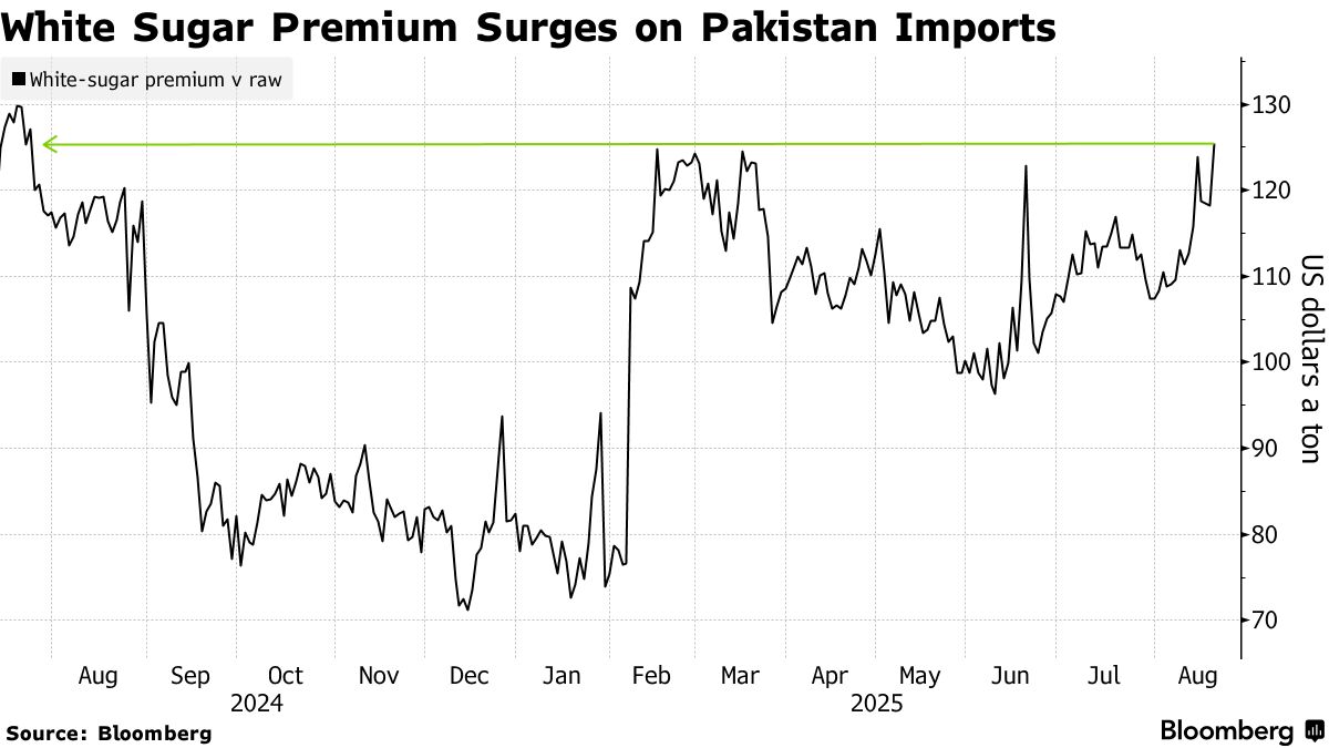 白糖对原糖的溢价扩大至一年多来最高水平,因巴基斯坦的采购提振了精制糖需求。