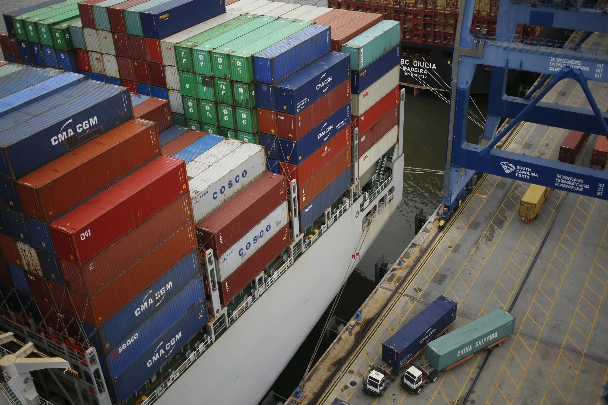 南卡罗来纳州芒特普莱森特查尔斯顿港,东方海外货轮上堆放的集装箱。