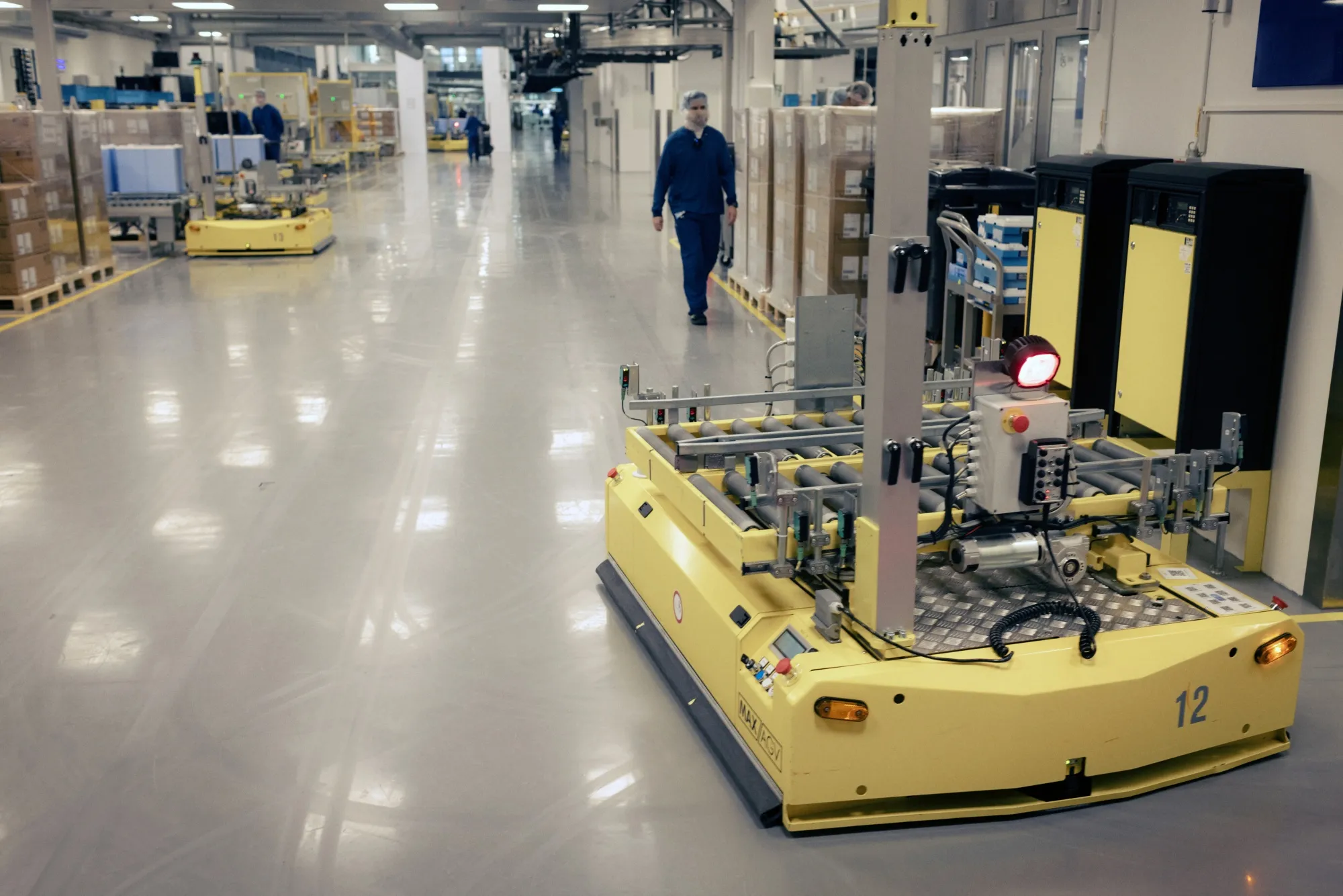 在丹麦希勒勒的诺和诺德公司生产设施中,机器人正在搬运成品箱。