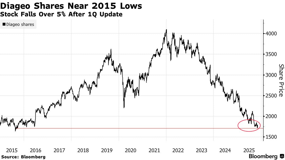 在伦敦,股价下跌了最多6.4%,是自2024年7月以来的最大跌幅。今年截至周三,股价已下跌29%,而竞争对手保乐力加公司则下降了22%。