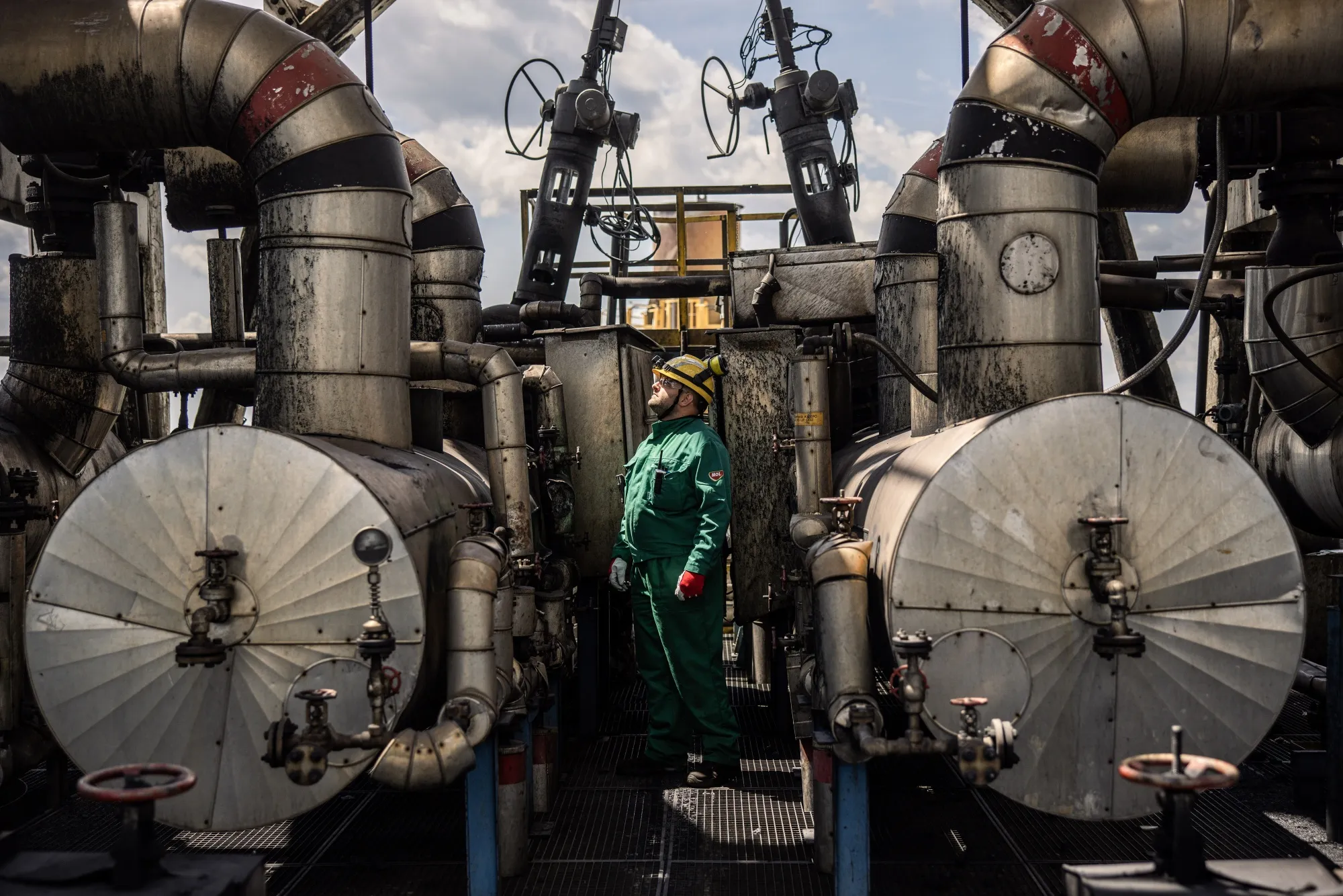 一名工人在匈牙利Szazhalombatta的石油炼油厂检查炼油结构。