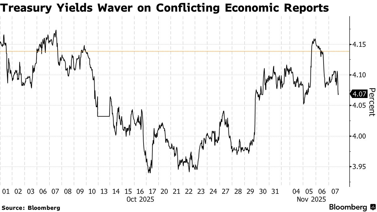 劳动力市场疲软的迹象——这是9月和10月美联储降息的理由——在本周推动了国债的上涨。但强劲的迹象也促使了抛售。与此同时,劳工部的标志性就业报告连续第二个月未能发布,因为自10月1日开始的美国政府停摆成为有记录以来最长的停摆。