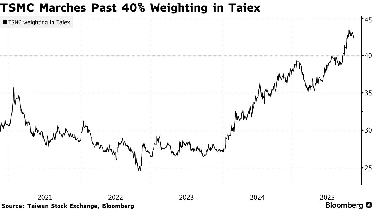 凭借今年的大幅上涨,TSMC现在占台指近43%。它在MSCI新兴市场指数和MSCI亚太(不包括日本)指数中的权重已接近12%。