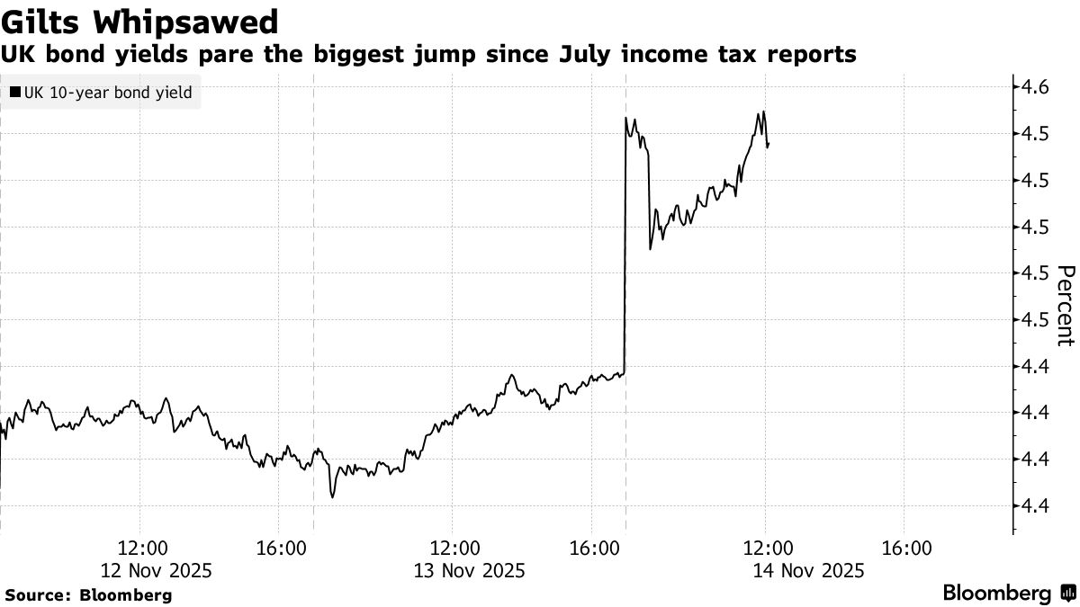 这种波动是由于周五一系列相互矛盾的头条新闻引发的。首先,政府借贷成本自7月以来最大幅度上涨,英镑和富时100指数暴跌,此前有报道称财政大臣瑞秋·里夫斯放弃了在预算中提高所得税的计划。随后,彭博新闻报道改善的英国预测是导致这一变动的原因。