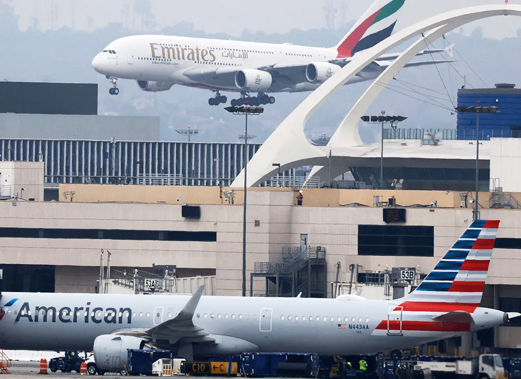 一架阿联酋航空的飞机在洛杉矶国际机场。