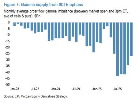 来自0DTE期权的伽马供应来源:摩根大通随着投资者专注于越来越短的波动窗口来管理风险,从零到五天到期的合约影响力激增。特别是零天到期的期权在标准普尔500指数整体交易量中占比约60%,不断攀升新高。