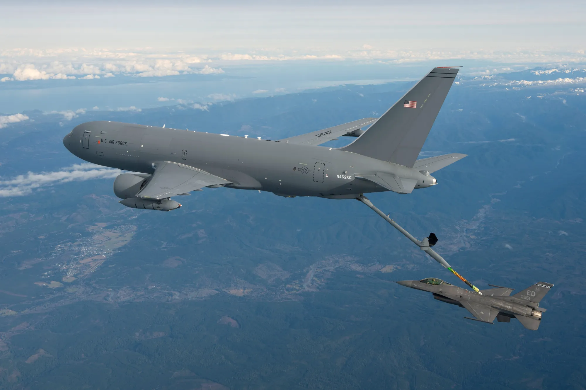 一架波音KC-46美洲狮加油机正在为F-16加油。