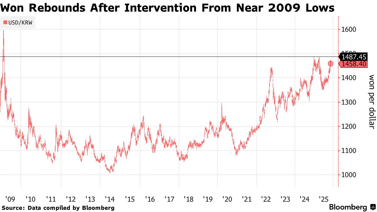 即使在11月14日的举措之前,ING和Woori银行预计到2026年第一季度,韩元将分别反弹至约1,400和1,420韩元兑美元。韩元在本季度下跌了4%,接近自2009年以来未见的水平,在当局介入后恢复至1,451韩元。