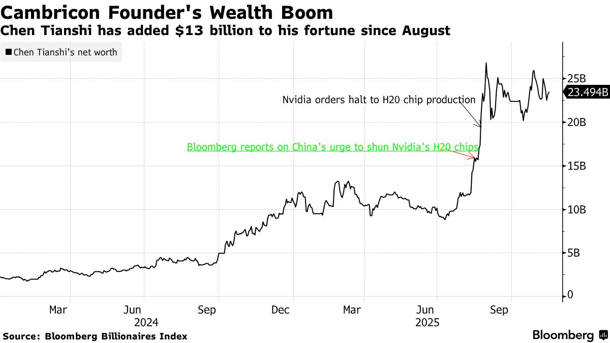 寒武纪的股票——以及陈的净资产——在八月份飙升,当时北京 敦促地方公司 避免使用市场领导者 英伟达公司 的H20处理器,特别是在与政府相关的用途上。