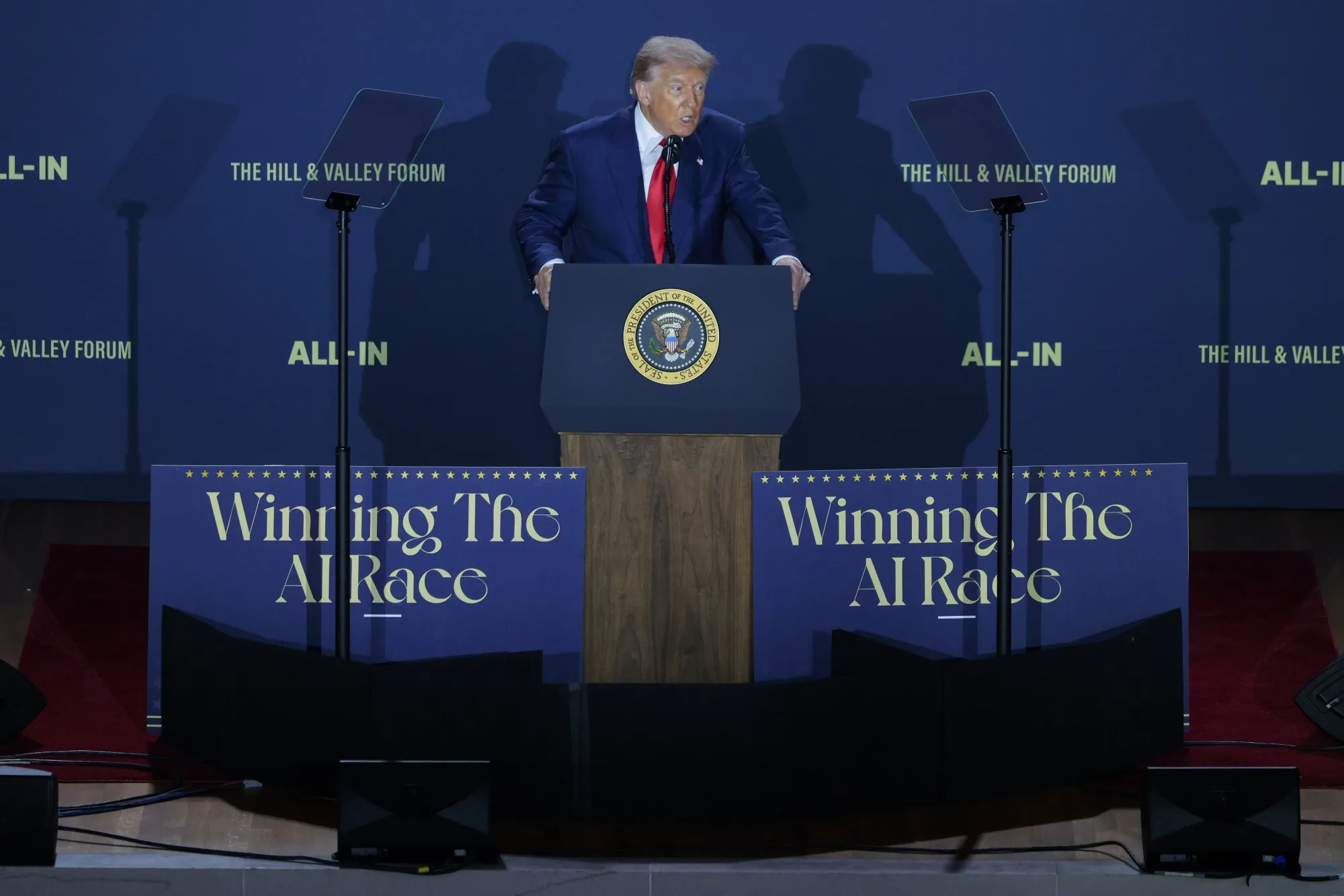 总统唐纳德·特朗普在华盛顿安德鲁·W·梅隆礼堂举行的“赢得人工智能竞赛”峰会上发言,时间是7月23日。