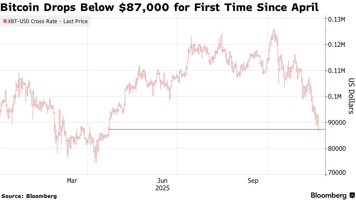 加密市场继续下滑,比特币跌破87,000美元 - 彭博社