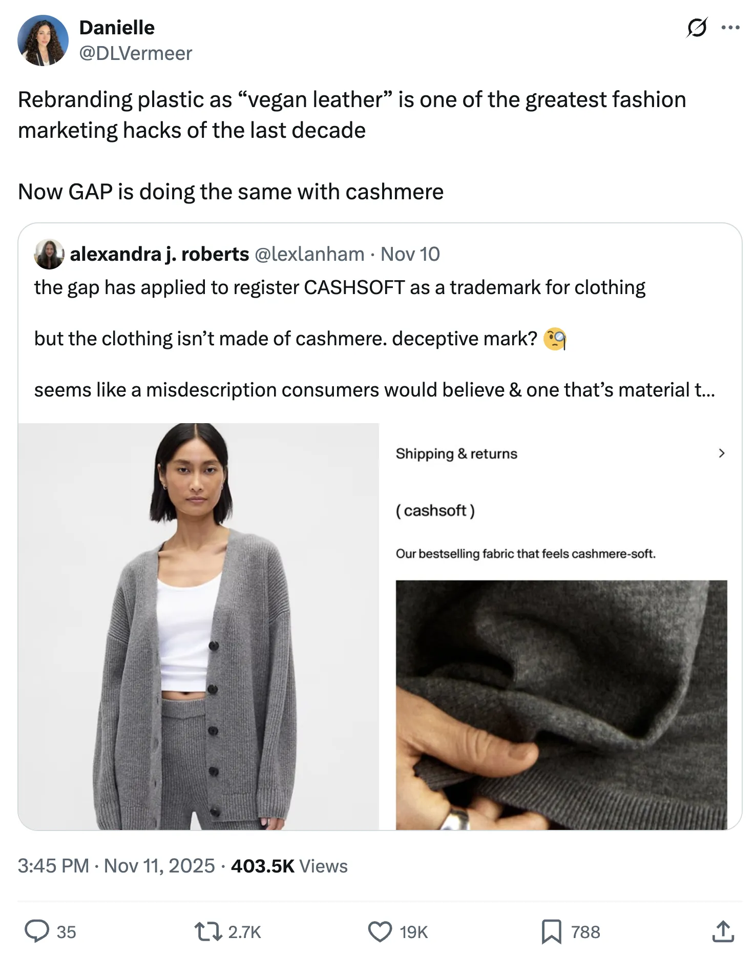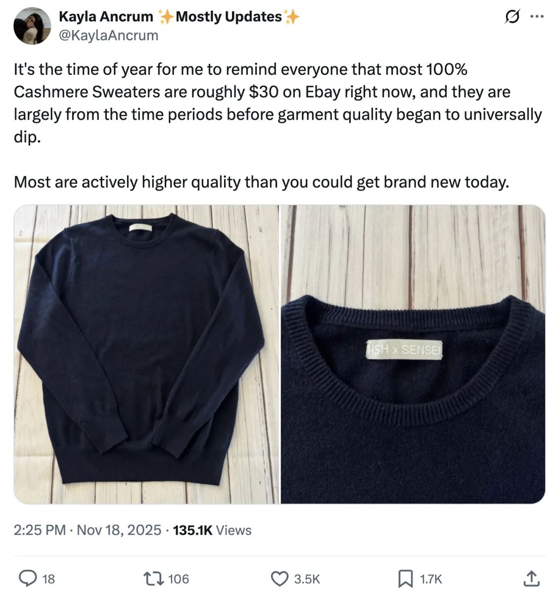 你知道现在衣架上看到的很多“开士米”其实根本不是开士米吗?相反,它是某种纤维的混合物,如果你坐得太靠近茶蜡,可能会着火。我和下一个Z世代一样喜欢Gap,但“cashsoft”——他们的开士米风格面料——是不是用山羊毛制成的!它由53%的棉、24%的尼龙和23%的丙烯酸组成。这没问题。只是别自欺欺人: