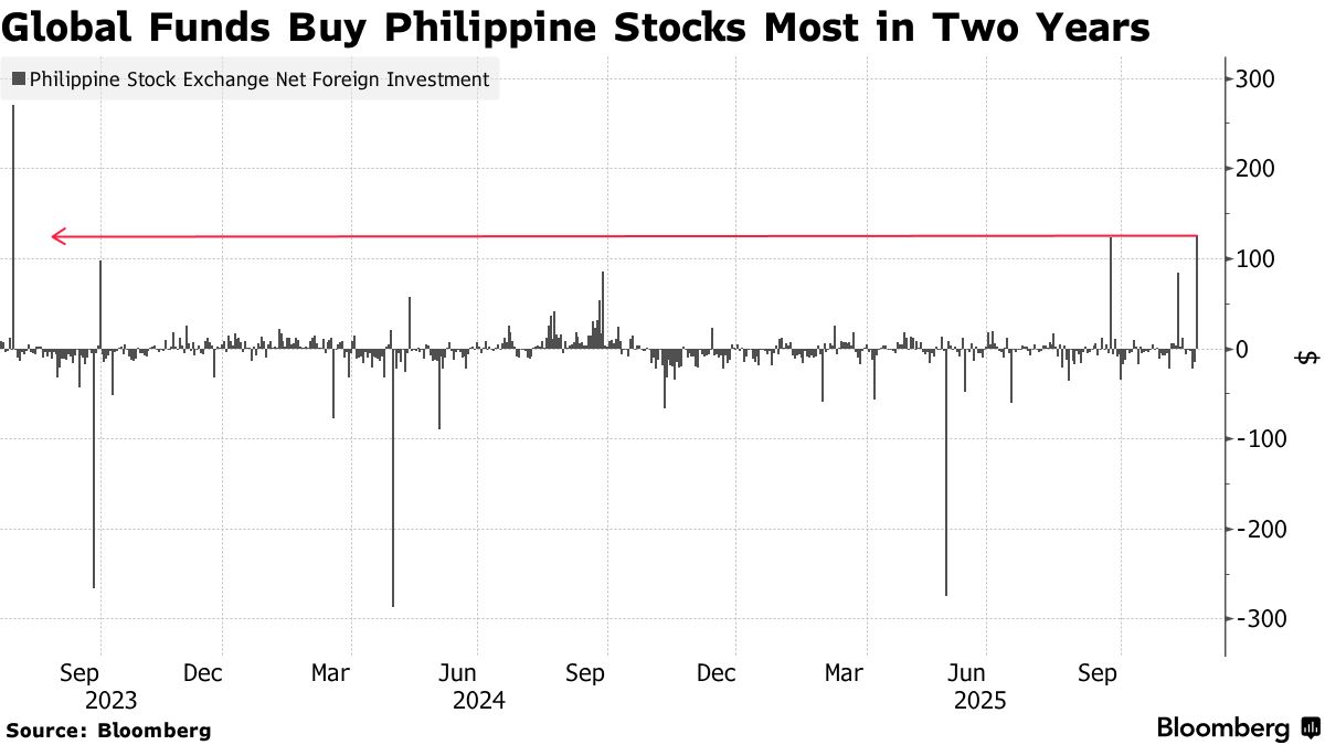 全球投资者在超过两年的时间里购买了最多的菲律宾股票,预计中央银行下个月将降息以促进经济增长。