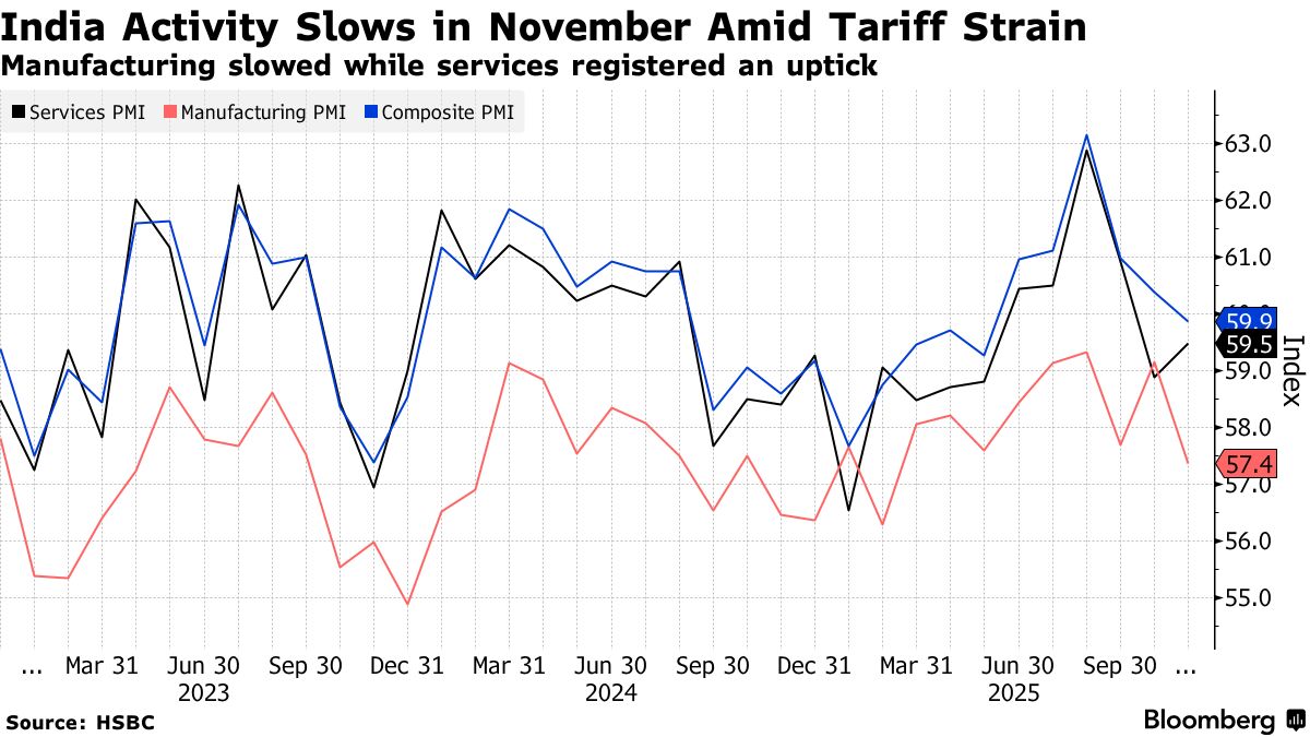 11月份,印度的经济活动放缓,影响了就业创造,汇丰控股有限公司的快速调查显示,由于美国的高额关税继续对南亚国家造成压力。