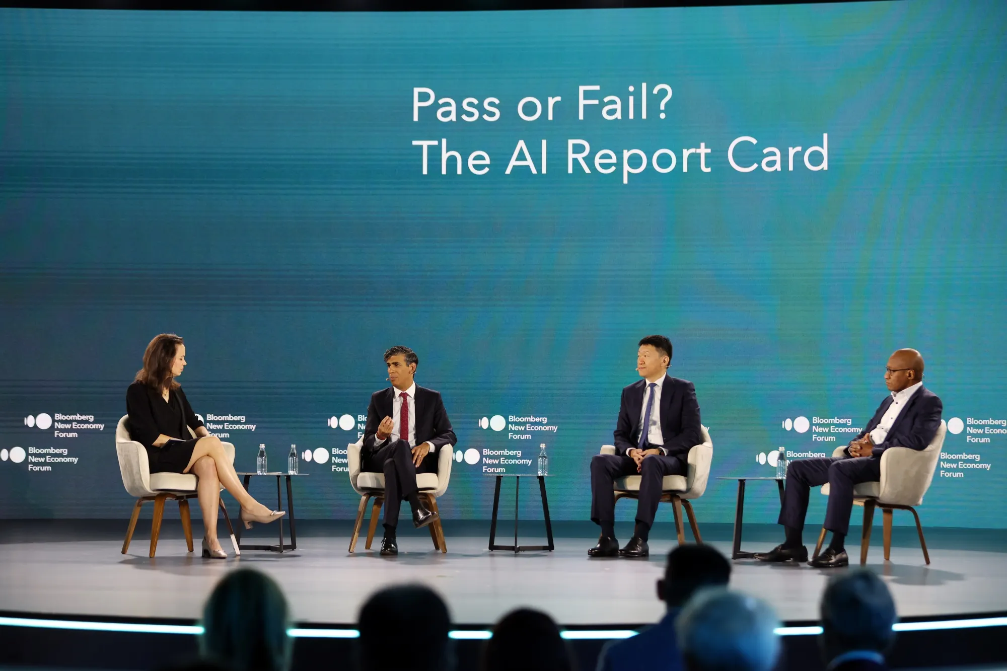 前英国首相里希·苏纳克(Rishi Sunak),左二,Sea Ltd.首席执行官福雷斯特·李(Forrest Li),以及普华永道国际有限公司全球主席穆罕默德·坎德(Mohamed Kande)。摄影师:莱昂内尔·吴(Lionel Ng)/彭博社 我是 克里斯·安斯蒂(Chris Anstey) ,波士顿的一名经济编辑。今天我们将关注彭博社旗舰 新经济论坛 的更多主题要点。请将反馈和提示发送至 [email protected] 。如果您尚未注册接收此通讯,可以在 这里 注册。