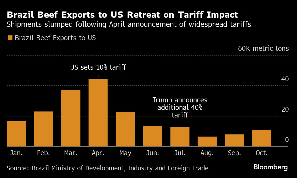 与此同时,牛肉问题对特朗普政府来说尤其棘手,因为消费者价格在全国牛群减少的情况下飙升至历史高位。美国越来越依赖进口来满足需求,这导致由于预计牛头数量增加而使得牛价下跌。但由于关税威胁,巴西的牛肉出口大幅下降。
