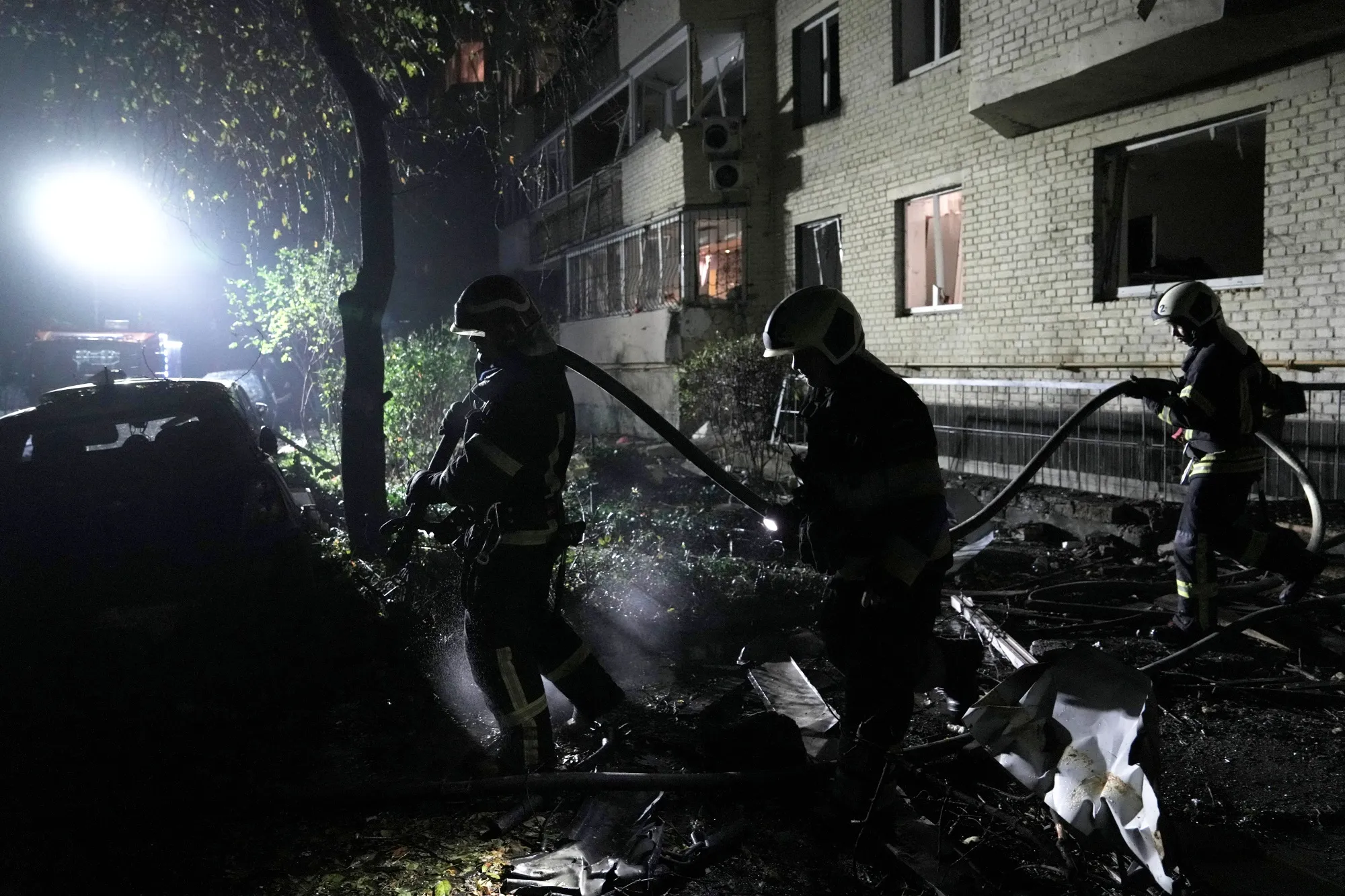 救援人员在2023年11月19日乌克兰特尔诺皮尔的住宅多层建筑遭到俄罗斯袭击的现场工作。