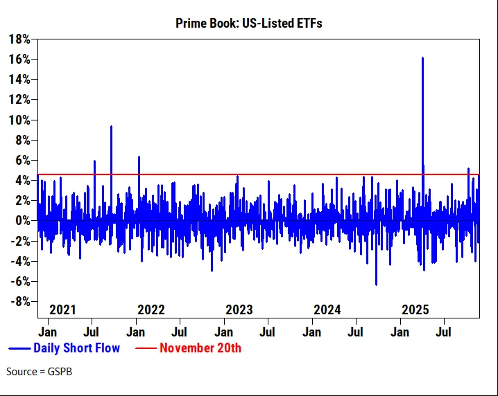 周四,美国交易所交易基金的空头头寸跃升了4.6%,这是今年第五大单日增幅,也是过去五年中最大的增幅之一,高盛的主要经纪数据表明。